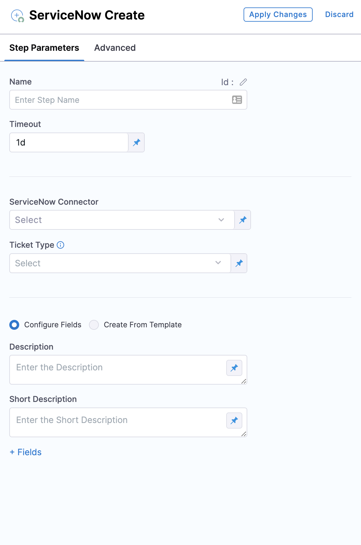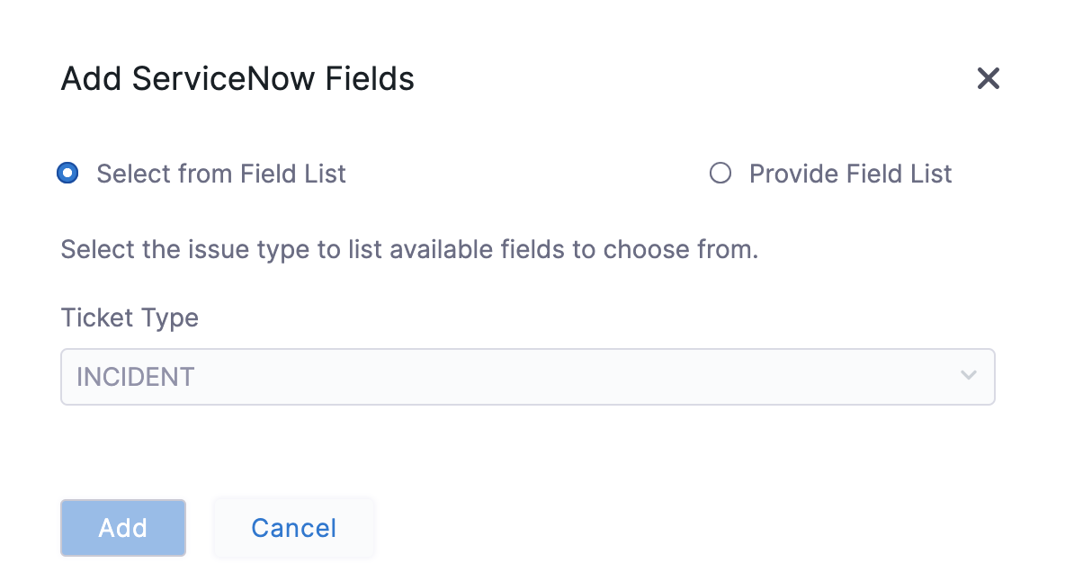 Select Configure Fields to select or add ServiceNow Fields to your ServiceNow ticket. This option enables you to access multiple custom fields from your ServiceNow integration.
