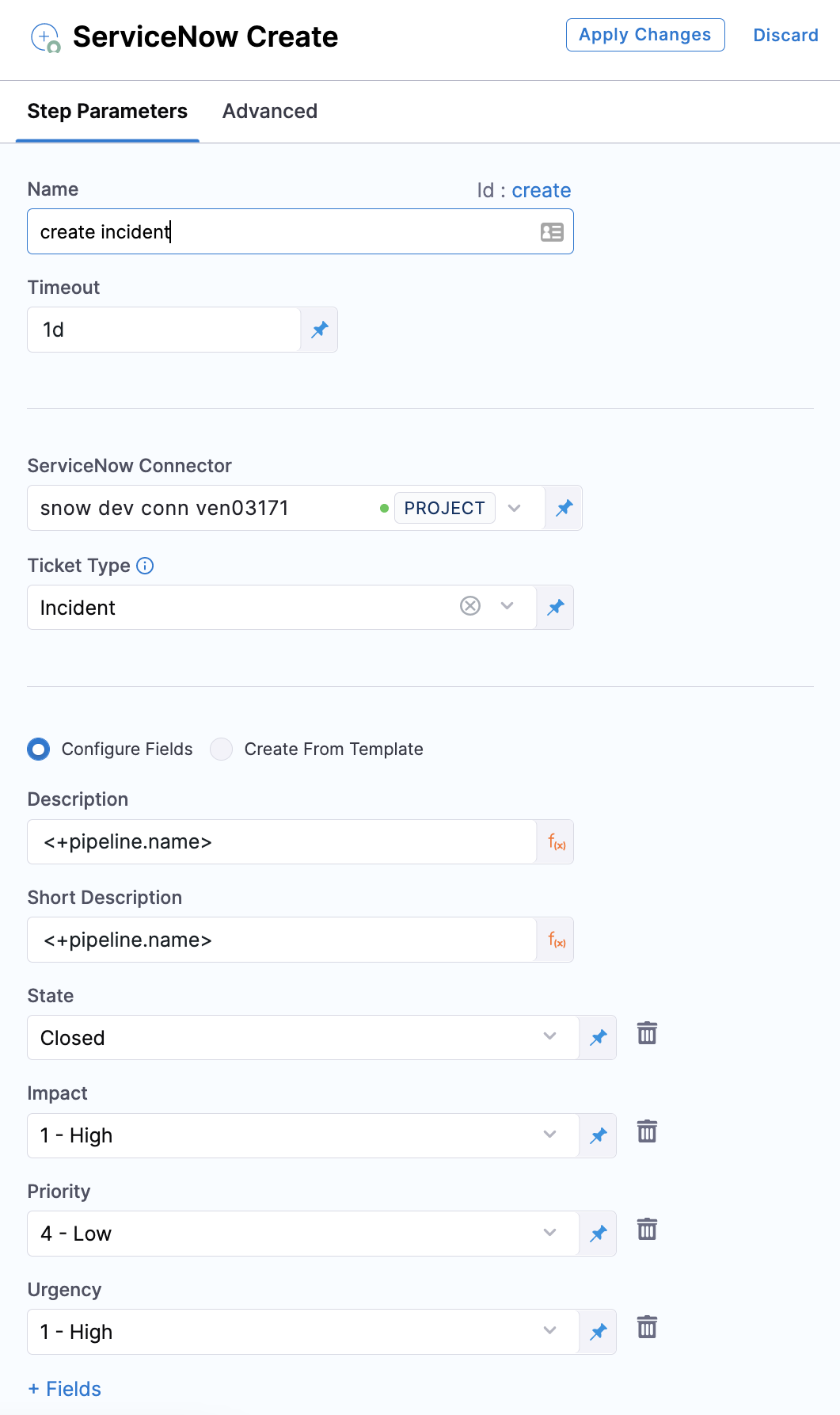 - Automatically create change requests in ServiceNow to track updates to your build, test, and production environments by adding a ServiceNow Create step in your pipeline.